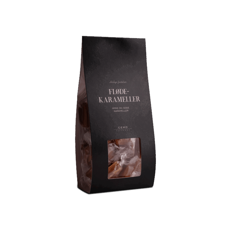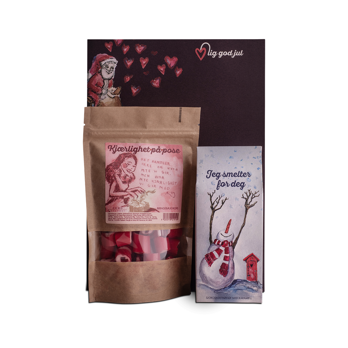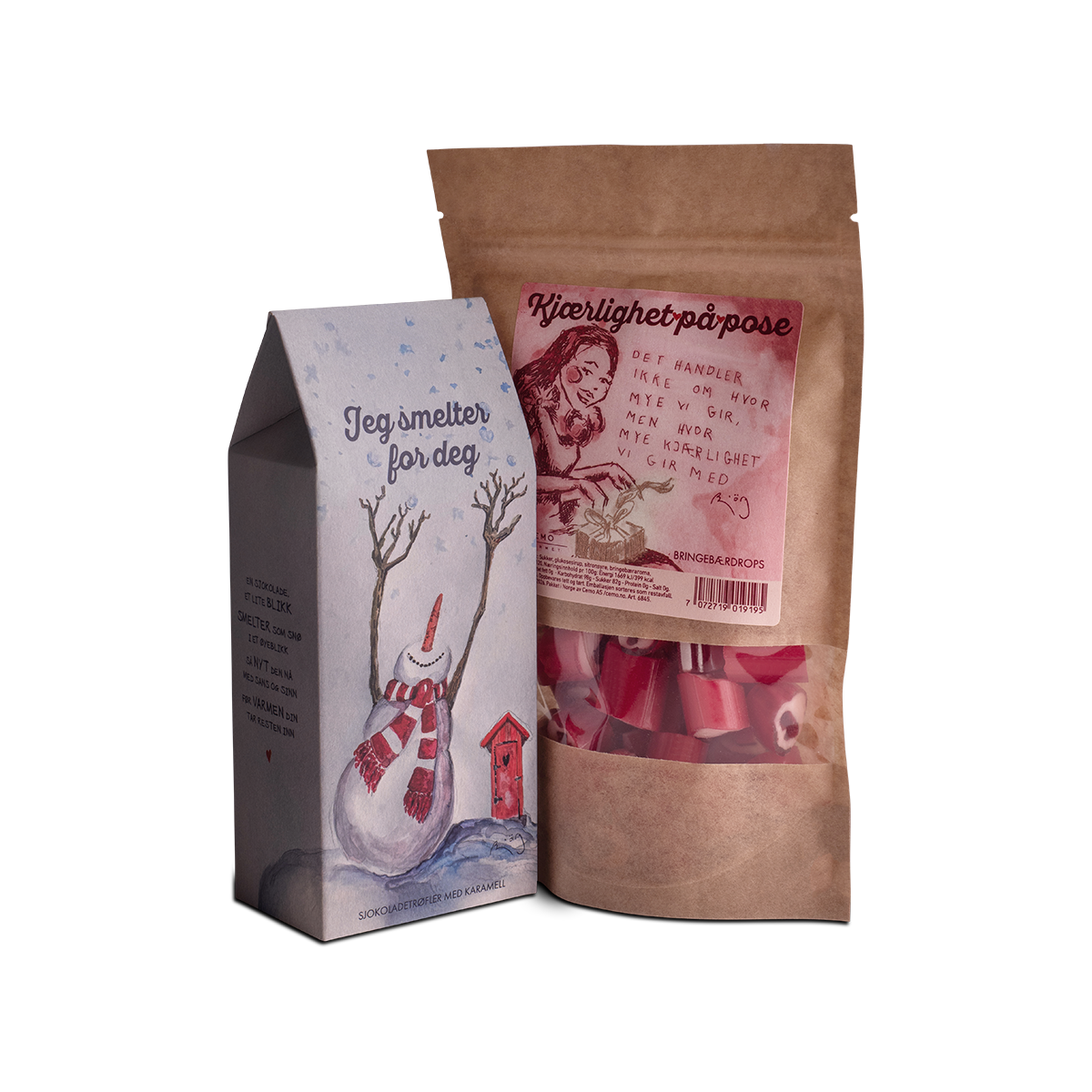 En liten gave fylt med sødme og omtanke. I cellofanposen finner du søte bringebærdrops,  «Kjærlighet på pose» sammen med sjokoladetrøfler «Jeg smelter for deg», rullet i kakaopulver og tilsatt små biter av salt toffee.