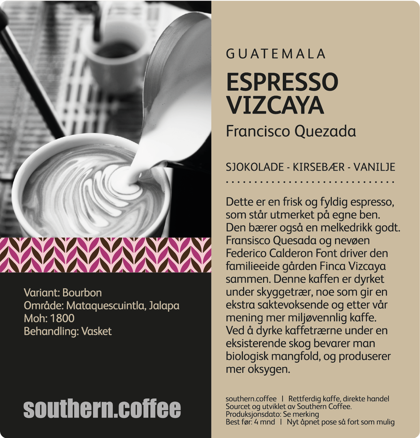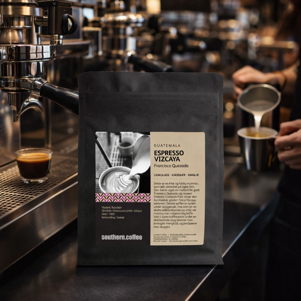 Dette er en frisk og fyldig espresso med smak av sjokolade, kirsebær og vanilje! Kaffen er selvfølgelig kjøpt direkte fra gården Finca Vizcaya.