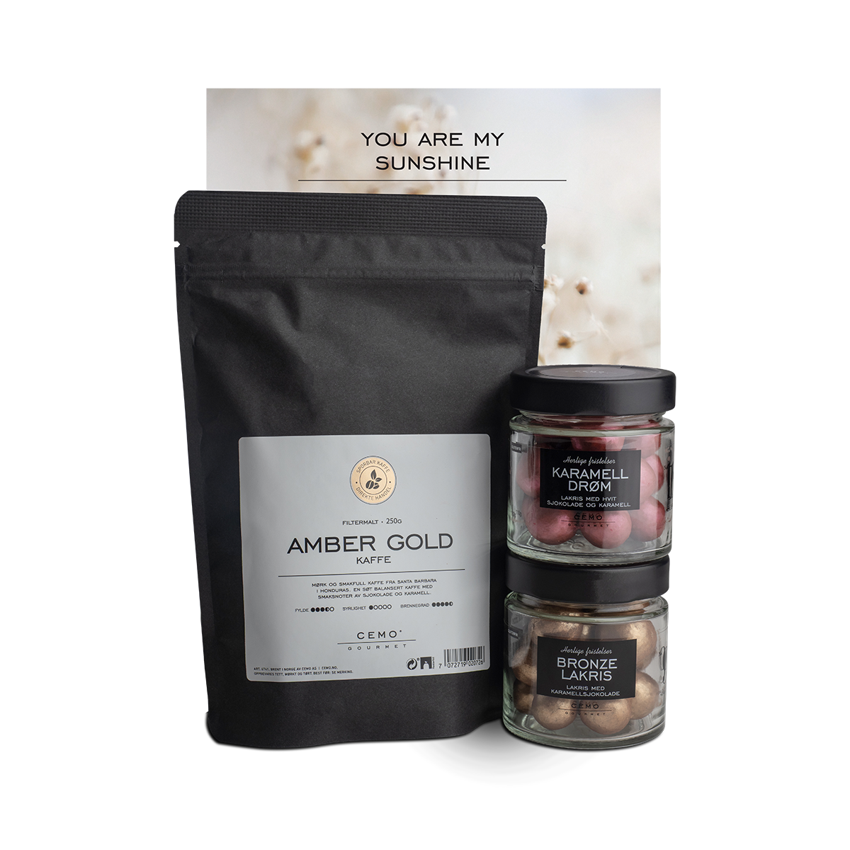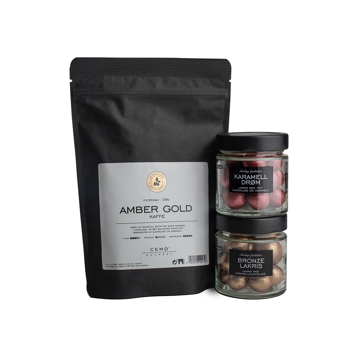 Denne gaveposen er satt sammen for å spre glede, energi og litt ekstra luksus i hverdagen. Her finner du aromatisk Amber Gold filtermalt kaffe, den unike kombinasjonen av sødme og dybde i Bronze Lakris, samt uimotståelig søte Karamelldrøm.