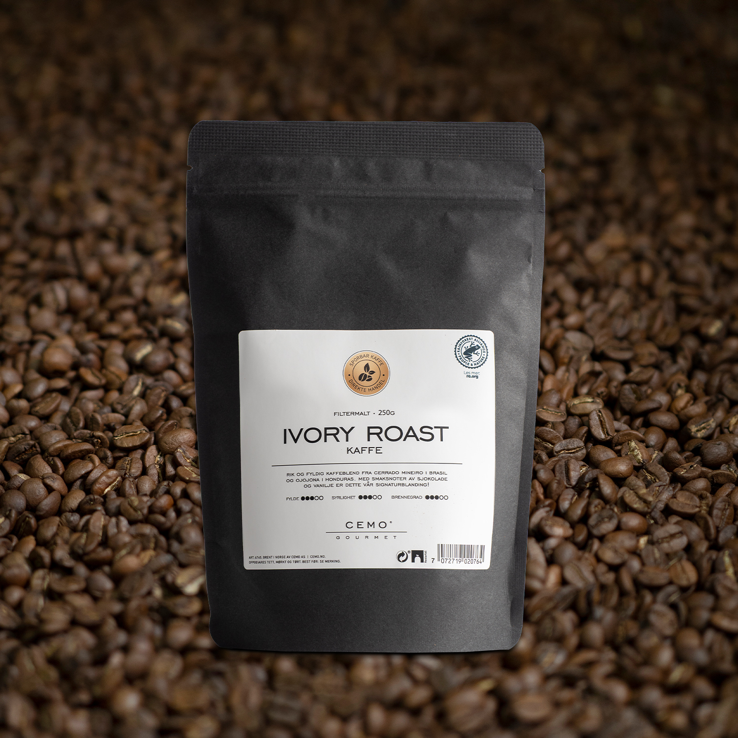 Kaffen har full sporbarhet og kjøpes direkte fra gård i Brasil og flere småprodusenter i Honduras. Kaffen er sertifisert i Rainforest Alliance som tar ansvar for mennesker og miljø. Vi handler kaffen direkte og rettferdig, dette sikrer bonden en inntekt som støtter familien, opprettholder produksjonen og utvikler kvaliteten år etter år.