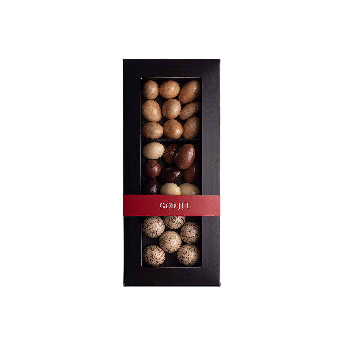 Klassikeren sjokolademandler er drasjert med yoghurtsjokolade, melkesjokolade og mørk sjokolade.