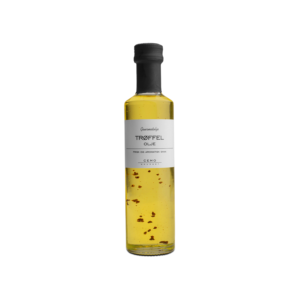 Ingredienser: Olivenolje, solsikkeolje, extra virgin olivenolje, trøffelaroma 0,5%, trøffelbiter. 125ml